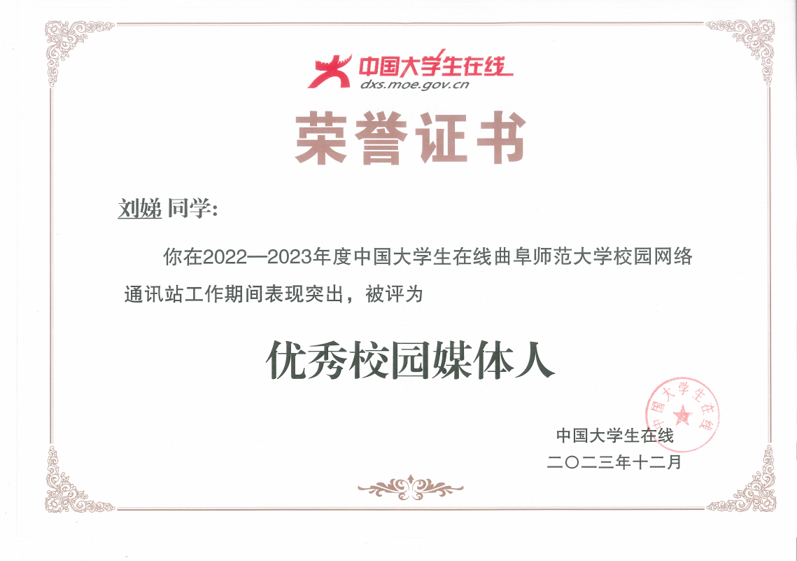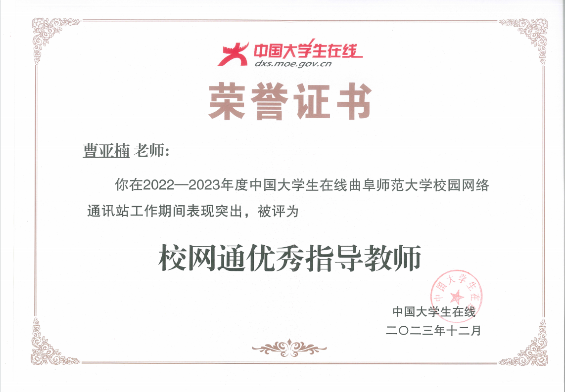 曲阜师大学生工作处讯 近日,中国大学生在线平台发布了《中国大学生在线校网通及校园行活动2023年度表彰名单》,曲阜师大获得多项荣誉。曲阜师大中国大学生在线网通站——华体会官方网学工在线获“优秀校网通站”称号,曲阜师大学生工作处获“校园行新星单位”称号,原创作品《第9次夺冠!再次获得“双料冠军”!》获评“年度优秀内容”,学生工作处曹亚楠老师获“校网通优秀指导教师”称号,心理学院学生、曲阜师大中国大学生在线校网通站站长刘娣获“优秀校园媒体人”称号。