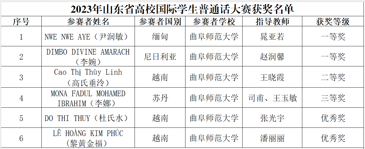 近日,山东省教育厅对2023年山东省高校国际学生普通话大赛获奖名单进行公示,曲阜师大获得一等奖2项,二等奖1项,三等奖1项,优秀奖2项;一等奖共设5名,曲阜师大分获第一名和第五名。同时,晁亚若、赵润馨、王晓霞荣获优秀指导教师,华体会官方网荣获优秀组织奖,朱献贞荣获优秀组织工作者。