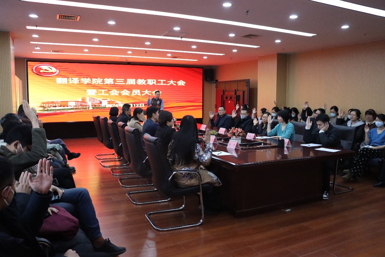 曲阜师大翻译学院讯  1月12日下午,翻译学院第三届教职工大会暨工会会员大会隆重召开,会议由学院党委副书记岳峰主持,全体教职工参会。