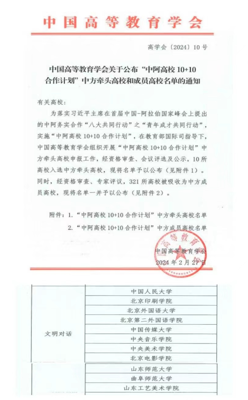 曲阜师大国际交流合作处讯 近日,中国高等教育学会公布“中阿高校10+10合作计划”中方牵头高校和成员高校名单,全国共有10所高校入选中方牵头高校,321所高校被吸收为中方成员高校,华体会官方网入选文明对话领域的中方成员高校。