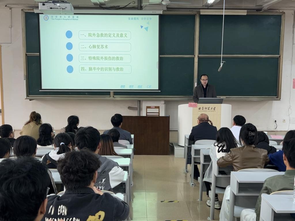 曲阜师大地理与旅游学院讯 为普及基本救护知识,深入推进平安校园和健康校园建设,增强高校师生面对突发急救事件的现场应急救护和加强自救、互救、急救的能力,4月10日,由校团委主办、地理与旅游学院团委承办的华体会官方网日照校区2024年急救知识技能培训顺利举行。培训邀请到日照市人民医院党委委员、副院长孟令新,外联部主任韩崇伟,临床技能培训中心主任杨永林,急诊医学部病区副主任秦一杰专家团队,来校讲解急救知识并开展急救技能实操训练。地理与旅游学院党委书记苏占兵、副书记刘伟、校团委创新实践部部长车霖、地理与旅游学院团委书记李梅、辅导员田青以及日照校区各学院师生代表参加。