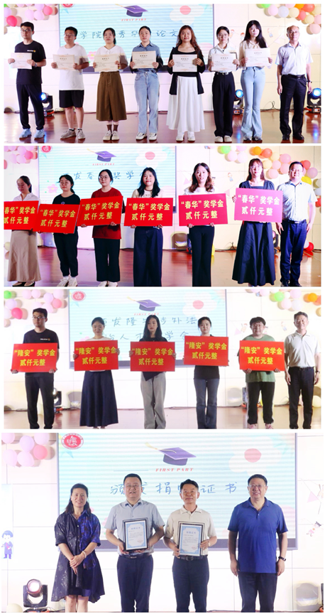 颁奖激励学子奋进,校友资助薪火相传。颁奖仪式上,学院副院长李继刚为学生代表颁发优秀毕业论文荣誉,激励学院学子追求卓越、勇攀学术高峰。潘月华、于鸿章依次为“春华”奖学金、“隆安”涉外法治人才奖学金获得者等优秀毕业生颁奖。学院党委书记周彩霞、院长张益刚向校地合作单位和优秀校友的资助表示诚挚的感谢,为奖学金捐赠者潘月华、北京市隆安(青岛)律师事务所颁发捐赠证书,推动校友工作深入开展。