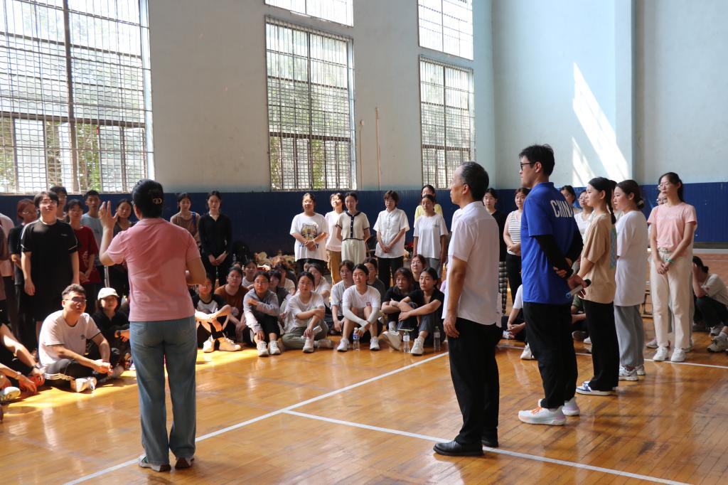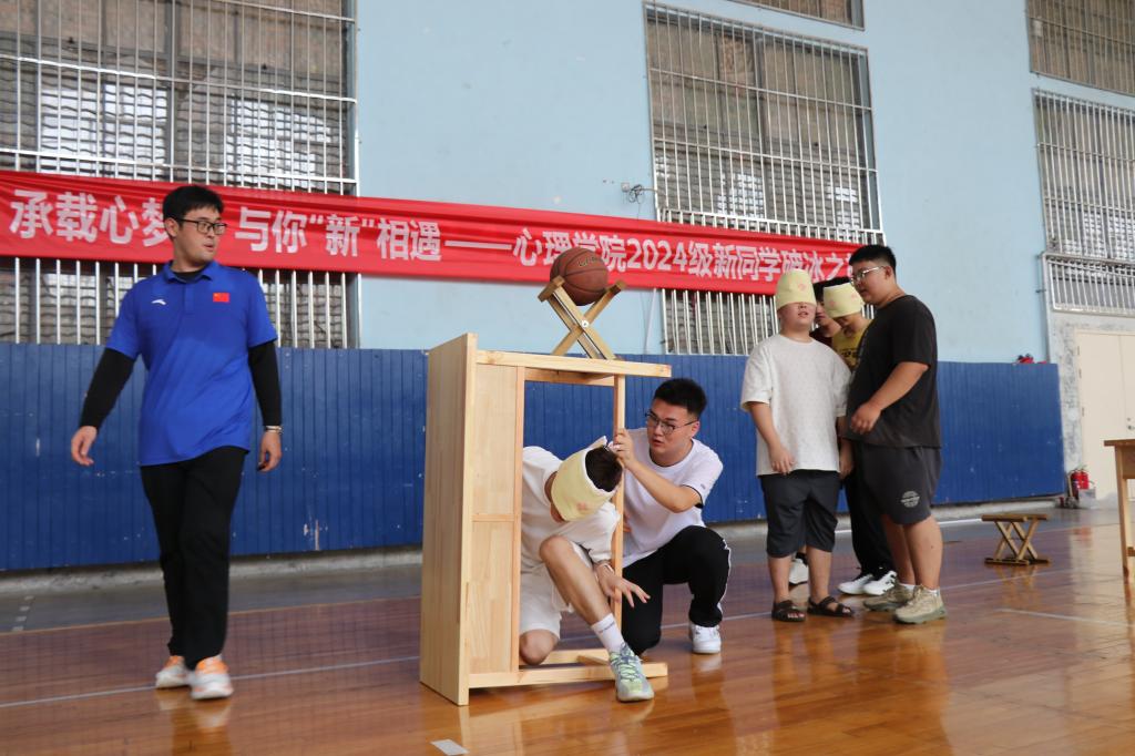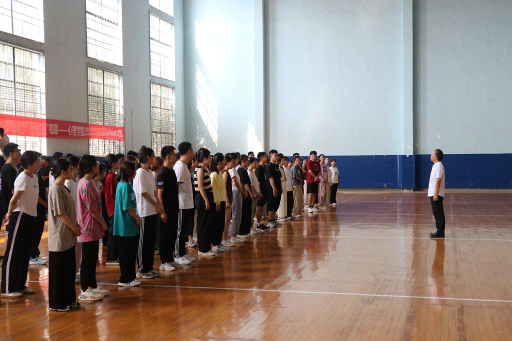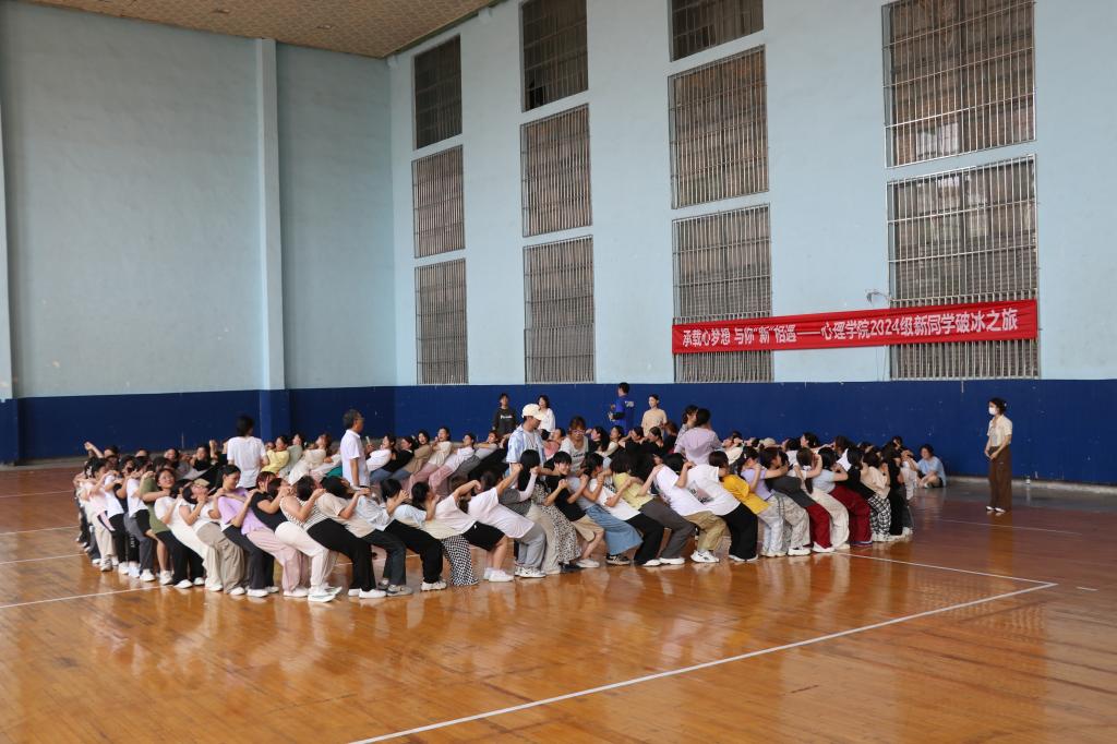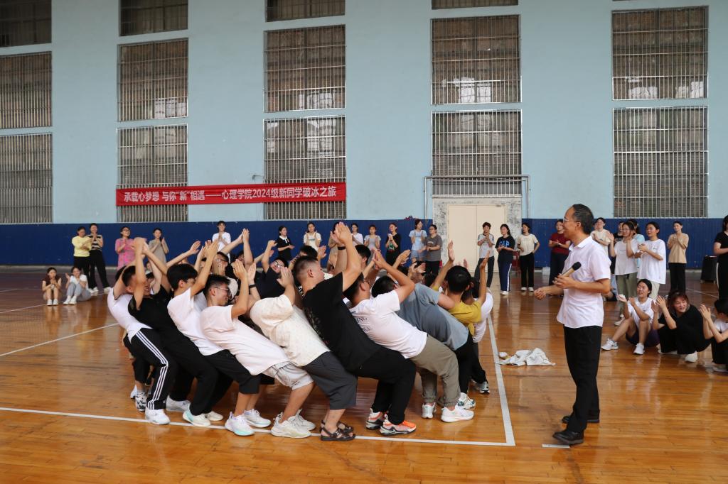 本次活动由心理学院张怀春教授主讲,学院党委副书记朱伟卫主持,学院辅导员和2024级全体新生共同参与,通过组织“分身不分手”解手链、“信任圈”搭人椅和“重走战火路”伤员伙伴肩并肩等活动,以生动的形式引导新生在相互扶持中向着同一个目标迈进,不仅有效帮助新生树牢集体观念和规则意识,增强集体荣誉感和沟通协作能力,同时让新生直观的感受到心理学专业的独特魅力。