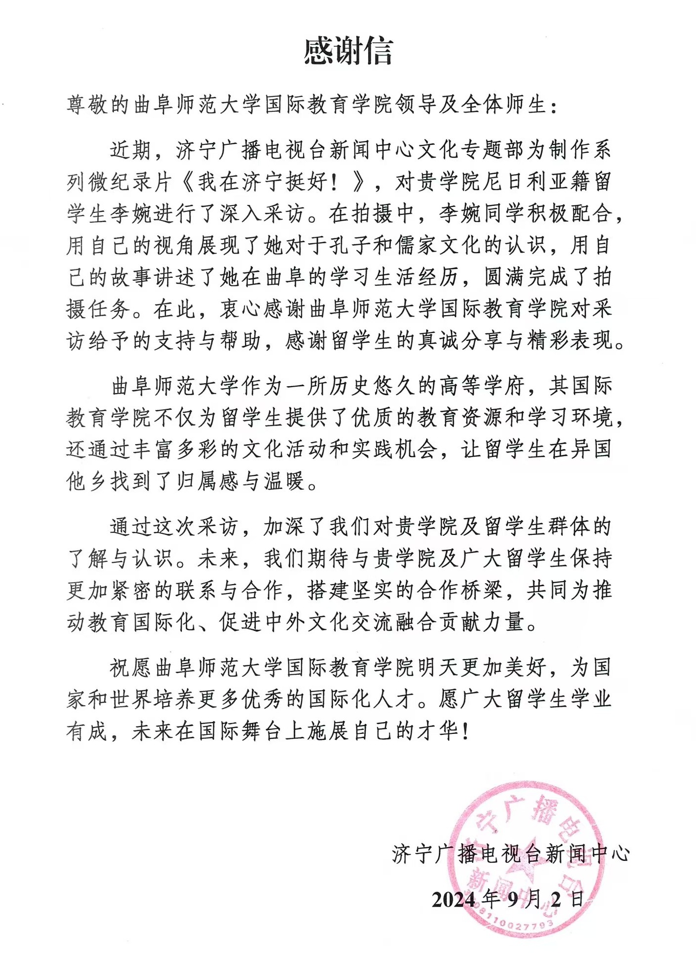 此次采访拍摄和新闻播放,展现了曲园学子的良好精神风貌,擦亮了“留学曲园”的品牌,提升了学校的社会知名度,对此,济宁广播电视台新闻中心特致感谢信,充分肯定了李婉同学的真诚分享和精彩表现,并对学校给予的支持和帮助表示诚挚的感谢。