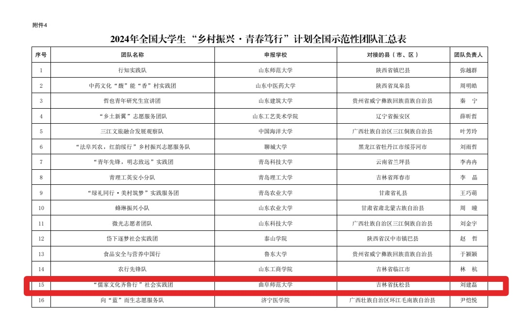 曲阜师大历史文化学院讯 近日,2024年全国大学生“乡村振兴·青春笃行”计划评选结果揭晓,我校历史文化学院“儒家文化齐鲁行”社会实践团在激烈的竞争中脱颖而出,荣获全国示范性团队。