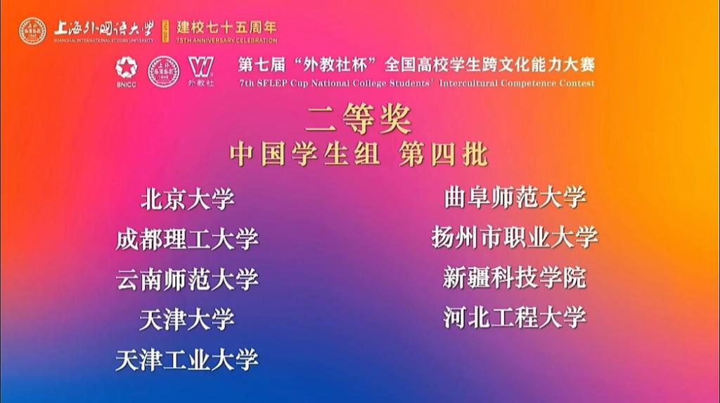 曲阜师大公共外语教学部讯 11月28日至12月1日,第七届“外教社杯”全国高校学生跨文化能力大赛成功举办。由巩奕含(统计与数据科学学院)、崔又心(统计与数据科学学院)、杨浩然(外国语学院)组成的华体会官方网代表队荣获全国二等奖,公共外语教学部副教授仲蕾荣获优秀指导教师奖,这是华体会官方网在该项赛事中首次荣获国家级奖项,取得历史性突破。