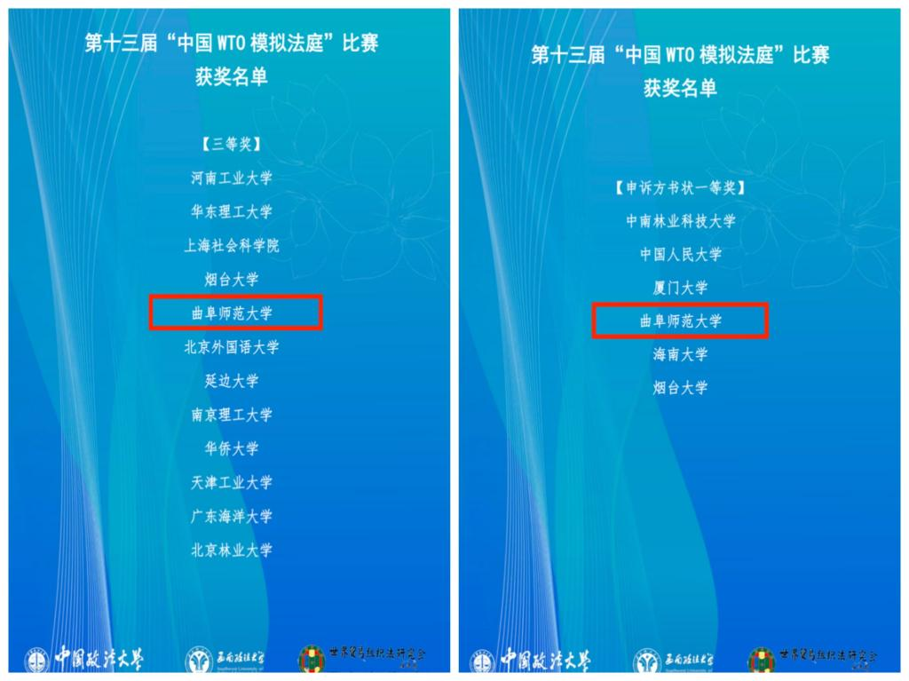 曲阜师大法学院讯 11月30日至12月8日,第十三届中国WTO模拟法庭竞赛成功举办。由曲阜师大法学院组成的代表队荣获“全国三等奖”、申诉方书状“全国一等奖”,创下华体会官方网代表队参赛以来最高纪录。