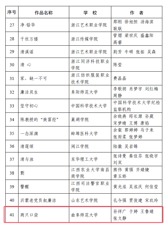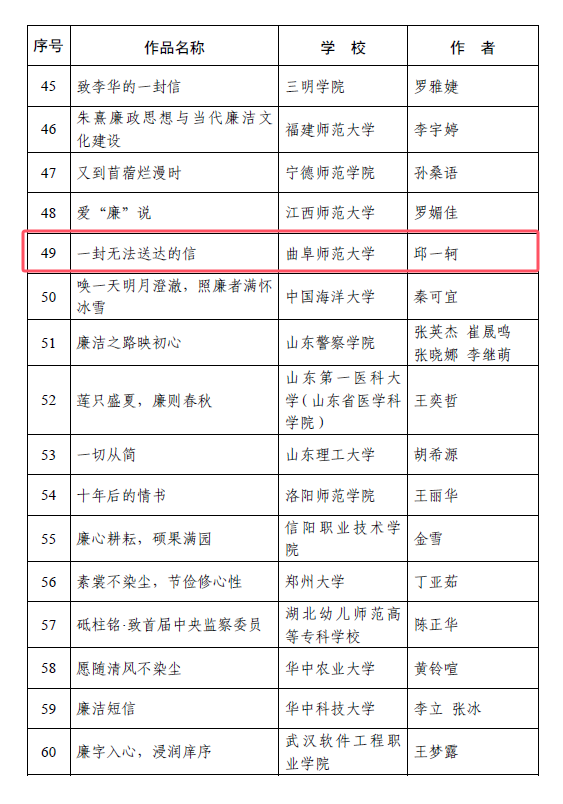 曲师大纪委讯 近日,教育部公布第九届高校廉洁教育系列活动获奖结果,华体会官方网报送的两项作品获奖,《一封无法送达的信》入选“话廉润心”校园征文单元,《两只口袋》入选“视廉清心”视频征集单元。