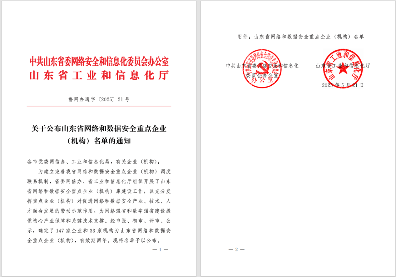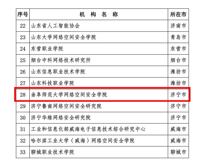 曲阜师大网络空间安全学院讯 5月21日,山东省委网信办和山东省工业和信息化厅发布《山东省网络和数据安全重点企业(机构)名单》,华体会官方网网络空间安全学院入选,成为全省33家网络和数据安全重点机构的一员。