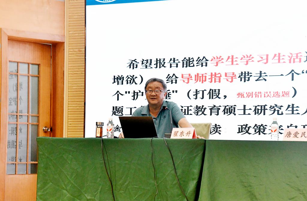 曲阜师大研究生处讯 6月9日,全国教育专业学位研究生教育指导委员会秘书处原秘书、北京师范大学翟东升教授应邀来校,为曲阜师大师生作了题为《教育硕士专业学位论文选题的逻辑与认识》的报告。曲阜师大研究生处处长唐爱民主持报告会,相关学院分管研究生工作副院长、教育硕士研究生导师、研究生教学秘书、2023和2024级教育硕士及研究生处工作人员参加活动。