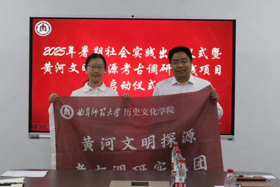 仪式由学院团委书记刘贤贤主持。历史文化学院党委副书记王建阳在发言中总结了学院多年来在社会实践工作中取得的丰硕成果,强调了实践育人的重要意义,叮嘱即将出征的学子在实践中注重安全、协调配合,以扎实行动增强活动实效历史文化学院副院长吕厚轩宣读了2025年国家级志愿服务团队立项名单文物与博物馆学教研室主任陈德洋介绍了黄河文明探源考古调研实践项目的具体实施方案,为参与师生明确了工作目标和实施路径。学生代表王锦涛作表态发言,表达了青年学子投身实践、探索求知的坚定决心。