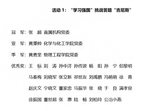 为庆祝中国共产党成立99周年,增进全校党员干部和师生员工深入学习习近平新时代中国特色社会主义思想的积极性和主动性,6月15-24日学校举办“献礼七一 学习再出发”——学习强国知识竞赛系列活动。现将各项竞赛成绩公布如下: