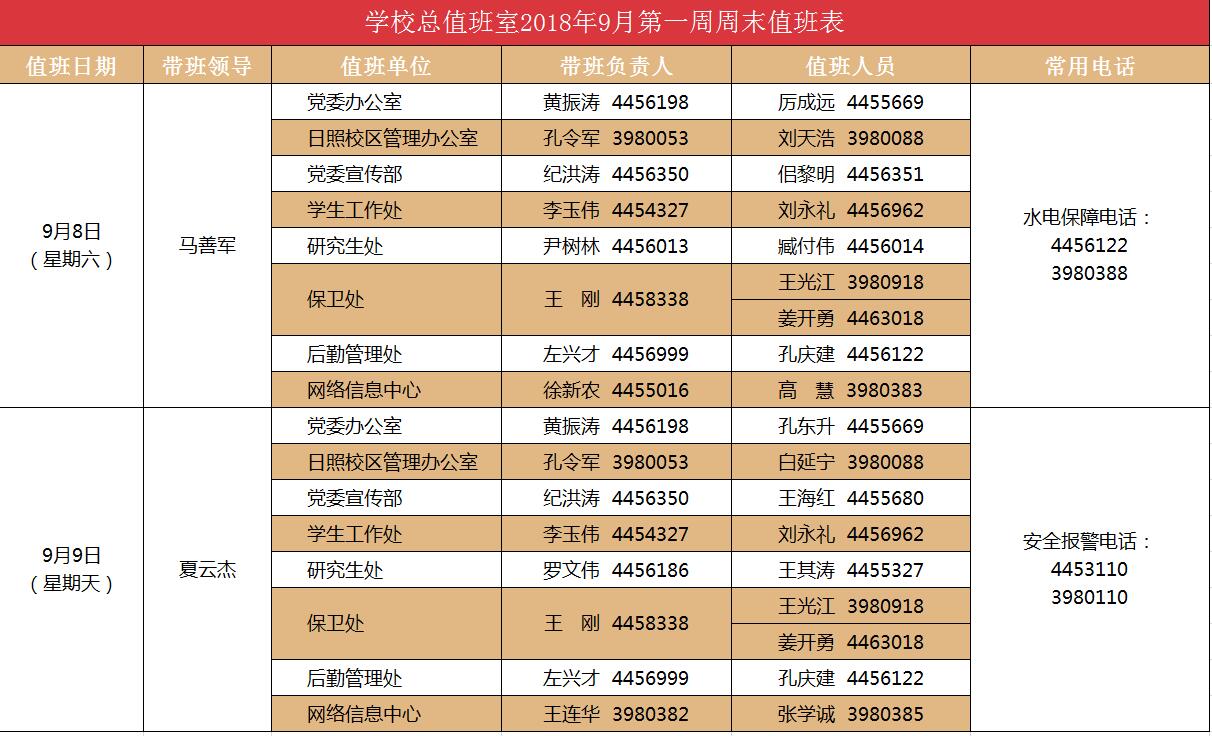 学校总值班室2018年9月第一周周末值班表