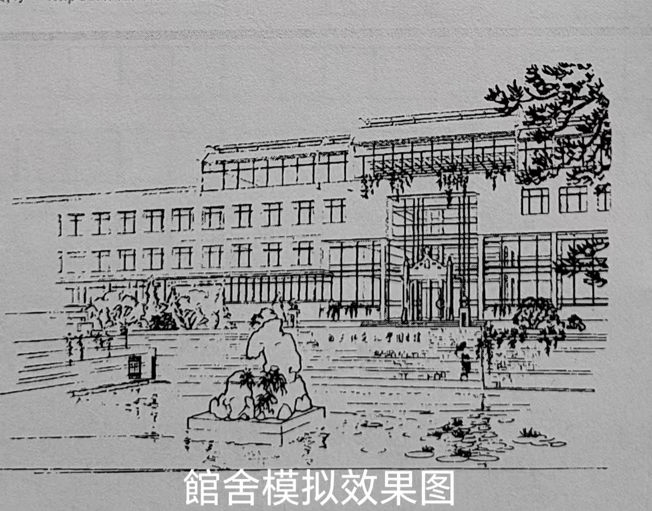 在学校招标时,共有五家设计院参与投标。在投标方提出的方案中,有四个都是通过推平萃华园来建成馆前广场,只有一个方案是尽量保留萃华园。该方案的主要特点是因地制宜,随形就势,注重与周边环境相融合。同时,考虑到校园内水面太少,在馆舍前增设水池,与萃华园内的小河连为一体。该方案还将报告厅独立出来自成体系,设在萃华园西北方,顶部建一小亭,与东南方向九山峰侧小河边的中式小亭一东一西,一高一低,遥相呼应。再改建园西南部的土山,使萃华园更加完美。馆舍一层则采用石头墙面,与学校的早期建筑风格保持一致。