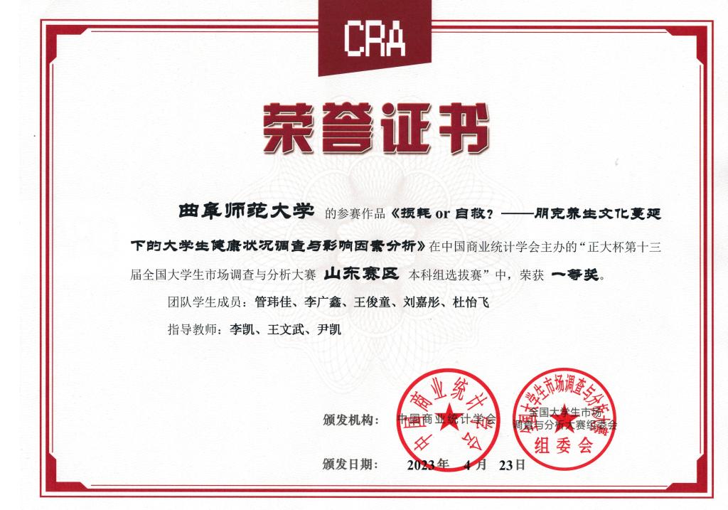 科研竞赛方面,我指导学生获得第十三届全国大学生沙盘模拟经营大赛全国总决赛一等奖、国家级全国大学生创新创业训练计划项目、第十三届全国大学生市场调查与分析大赛山东赛区本科组一等奖等省级以上竞赛获奖8项。社会实践方面,我获得2020、2021年华体会官方网“镜头中的三下乡”社会实践活动优秀指导老师,指导队伍分别获2021、2022年华体会官方网寒假社会实践校级一等奖。学术论文方面,我指导的本科论文获得2020年度华体会官方网优秀学士学位论文,2022年至2023年指导本科生完成学术论文5篇,已发表4篇。在我指导的2023、2024两届本科生中,有8人成功保研或考研,其中6人被录取到中国人民大学、北京工业大学等双一流高校,1人被东北财经大学录取,1人被圣安德鲁斯大学录取。