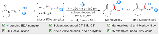华体会官方网文江伟副教授团队开发了光学活性H-键-S-EDA复合物模型,该EDA复合物模型解决了传统EDA复合物芳基底物的限制,并将其应用在光诱导下羰基活化烯烃的氢硫化和羟硫化。研究发现溶剂化效应是控制H-键-S-EDA复合物经快速电荷转移(CT)还是缓慢能量电荷转移(En-CT)的关键,从而调控位点选择性。