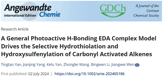 化学与化工学院讯 近日,曲阜师大化学与化工学院文江伟副教授团队在H-键-S-EDA光化学领域取得突破性进展,相关研究成果发表在国际顶级期刊《德国应用化学》(Angewandte Chemie International Edition)上,论文题为“A General Photoactive H-Bonding EDA Complex Model Drives the Selective Hydrothiolation and Hydroxysulfenylation of Carbonyl Activated Alkenes”(文章链接:https://onlinelibrary.wiley.com/doi/10.1002/anie.202405186)。华体会官方网为该论文的第一通讯单位,文江伟副教授为该论文通讯作者,德州学院李丙文副教授(理论计算部分)为该论文共同通讯作者,硕士研究生颜廷涛和团队教师杨建静博士为该论文共同第一作者。《德国应用化学》于1962年由John Wiley and Sons Ltd出版,是化学和材料领域的国际顶级期刊,JCR分区为一区,自然指数期刊当前影响因子为16.1。