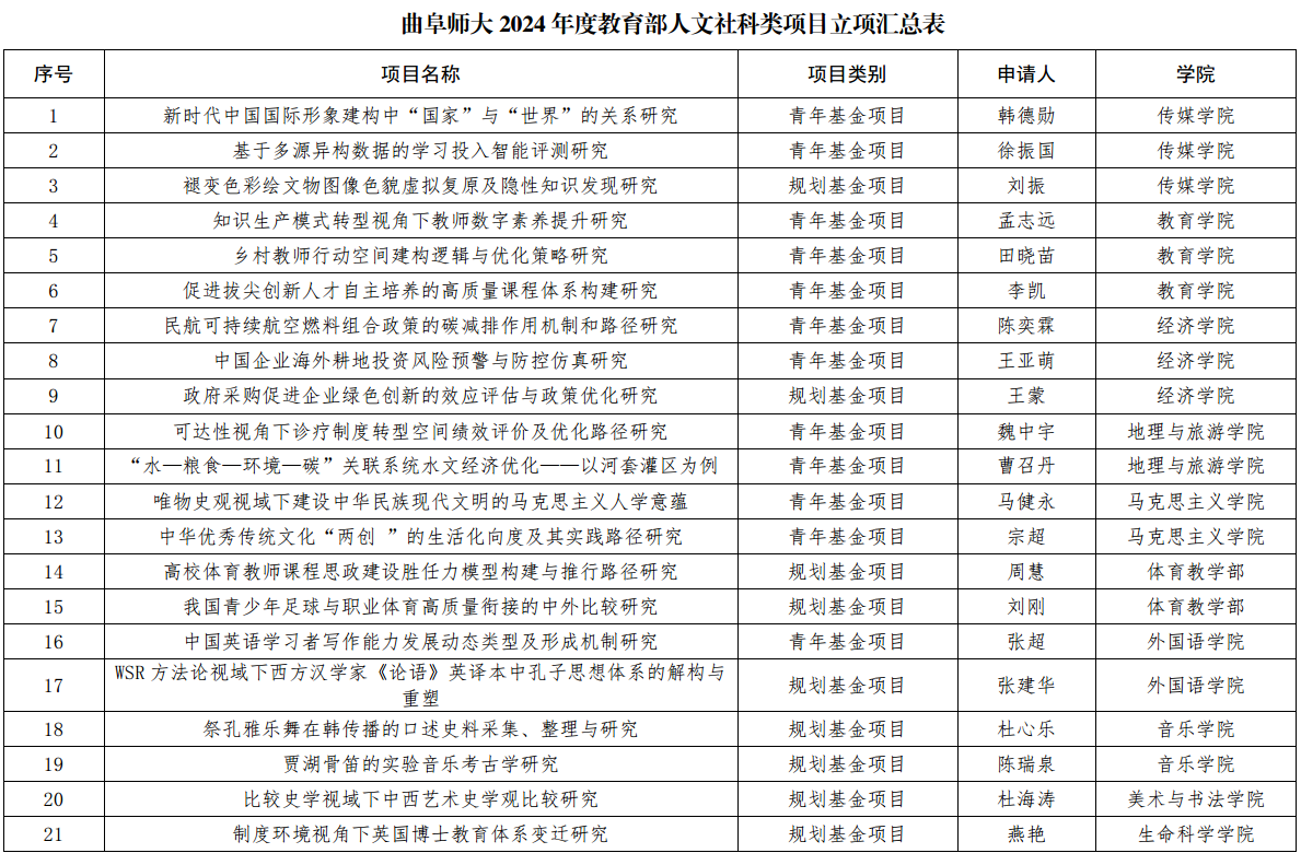 曲阜师大社会科学处讯 近日,教育部社科司正式公布了2024年度教育部人文社会科学研究项目立项名单,曲阜师大共27个项目获批立项,一般项目立项总数并列全国高校第8位,立项总数创历史新高。
