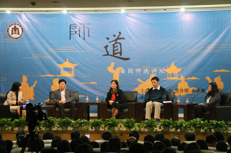 当主持人提出“一个好老师的标准是什么?怎样做一个好老师”的问题时,嘉宾们纷纷结合自己从师授业的故事给出答案。做过10余年辅导员的张立兴说,“好老师要有大爱精神 ,要爱学生、爱教育事业”。张立兴曾不远千里到学生家中家访,每天坚持写辅导员笔记,为身患癌症的学生熬制偏方、捐款救助,因为教导有方,他的第一届本科生著名导演姜伟曾画漫画尊他为“新时代的改革家”。32岁就评上教授的郑召文说,“一个好老师还要有较高的业务素质,科研教学能力强,才能服人。”这位年轻的博导曾主持过多项国家级课题,发表sci论文数篇,被学生尊称为“学术男神”。王仁君说,“好老师还要能够促进学生成长。”为解决学生学习、考研、择业等难题和困惑,除利用休息时间耐心指导外,她还精心制作了380页PPT,令诸多学生受益。张文娟说,“好老师还要尊重学生,形成亦师亦友的关系。”平等相处的理念使她参与指导的学生全部获得山东省从师技能大赛一等奖,取得了令人瞩目的成绩。