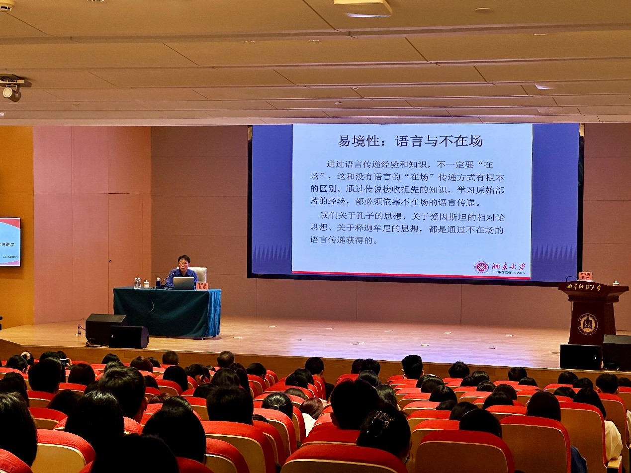 曲阜师大文学院讯 为营造良好的学术氛围,开拓学术视野,增进学术交流,4月10日下午,北京大学优秀共产党员标兵、北京大学中国语言学研究中心、北京大学中文系陈保亚教授应邀在我校西区报告厅为文学院师生作了题为《语言涌现:人类起源的关键环节——基于符号任意性原则的分析》的学术报告。本次报告由文学院张金圈教授主持,文学院党委书记左兴才、副院长李杰俊,文学院部分老师和二百余名本硕博学生参加。