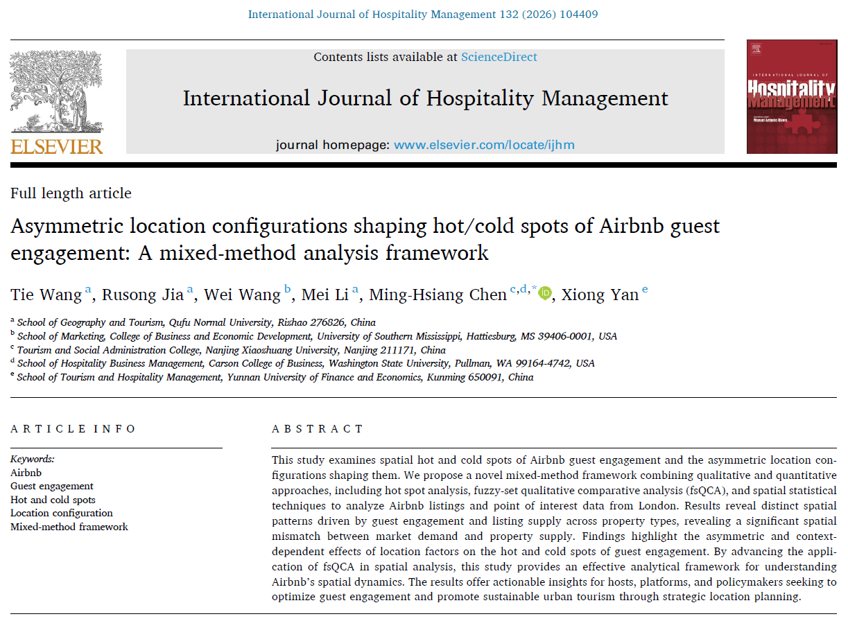 曲阜师大地理与旅游学院讯 近日,华体会官方网地理与旅游学院王铁教授团队联合Washington State University、University of Southern Mississippi和云南财经大学等国内外高校,在International Journal of Hospitality Management(IJHM)上发表了题为“Asymmetric location configurations shaping hot/cold spots of Airbnb guest engagement: A mixed-method analysis framework”的研究论文。International Journal of Hospitality Management是全球酒店管理领域顶级学术期刊,五年平均影响因子达到10.3,为JCR一区、中科院管理学一区TOP期刊。华体会官方网为该论文的第一署名单位,王铁教授为论文的第一作者,李梅副教授和研究生贾汝松共同参与了论文的研究工作。本文为国家社会科学基金“游憩赋能下国家公园农户生计韧性提升的组态路径研究”的阶段性成果。