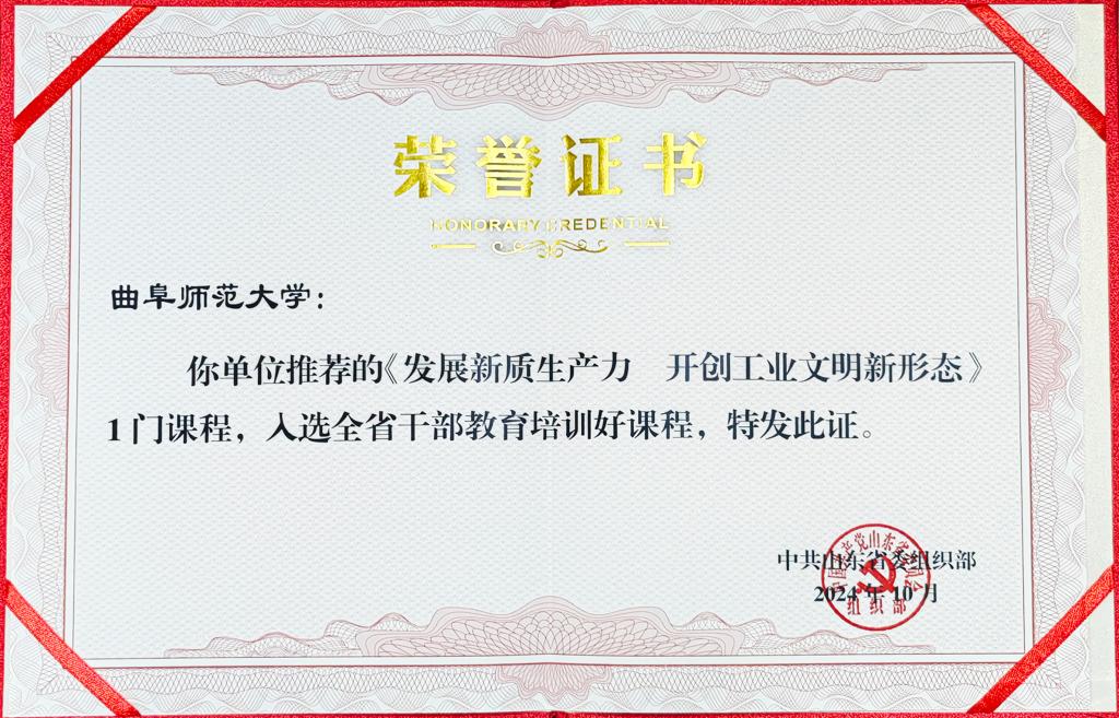 曲阜师大党委组织部讯 近日,中共山东省委组织部发布了《关于印发全省干部教育培训好课程推荐目录的通知》,曲阜师大党委常委、副校长刘刚教授主讲的《发展新质生产力 开创工业文明新形态》1门专题课程...